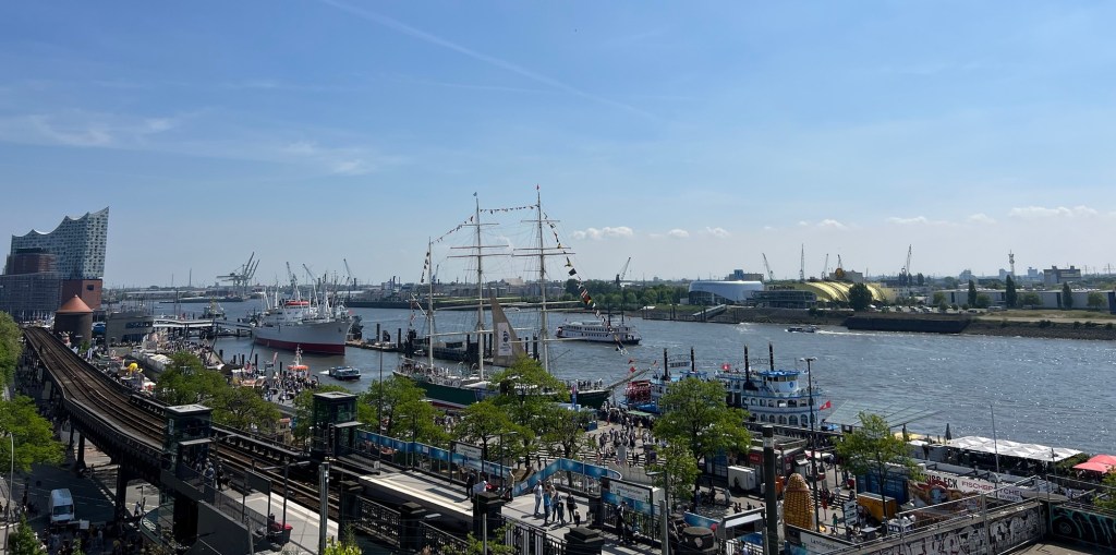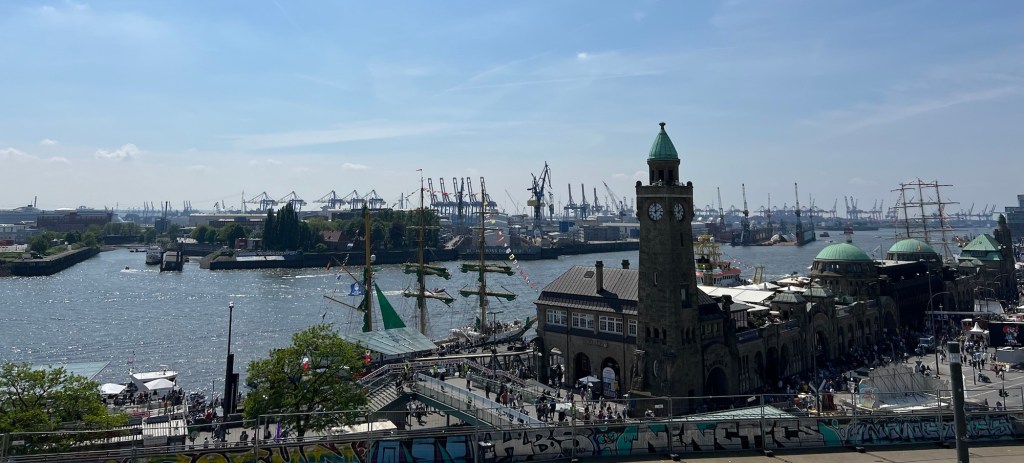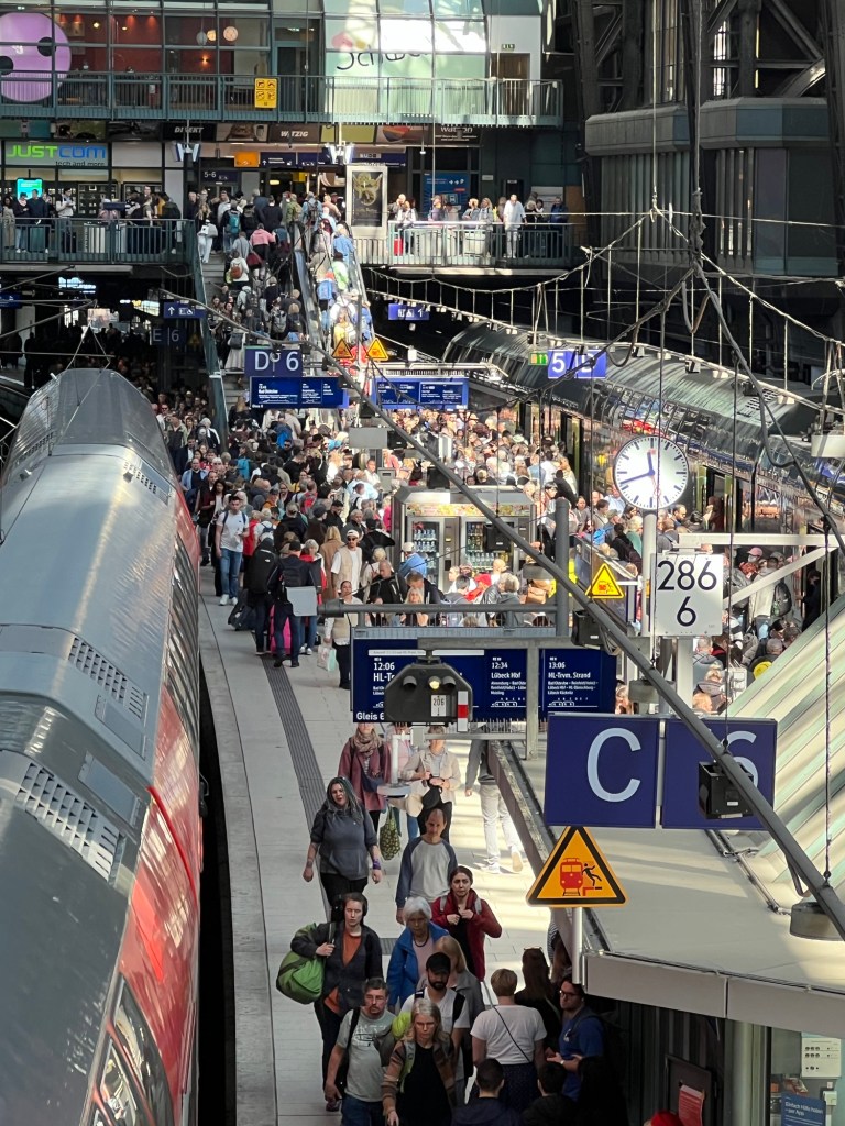 The above picture shows a wing of the central station with four platforms. Built between 1902 and 1906 it replaced several smaller stations located around the city centre. It has 20 island platforms (18 in usage). The Wandelhalle (Promenade hall) is a small shopping centre that includes restaurants, flower shops, kiosks, a gallery and more. Since 2008, in an effort to disperse drug dealers and users from the area, Deutsche Bahn has been playing classical music (e.g. Vivaldi’s Four Seasons). According to the German newspaper Hamburger Abendblatt this is a success. With an average of 550,000 passengers a day, it is Germany’s busiest railway station and the second-busiest in Europe after the Gare du Nord in Paris. I found navigating this station like being in a school of fish and diverting to a spot on the shore against the current. It is a most congested mass of scurrying people.