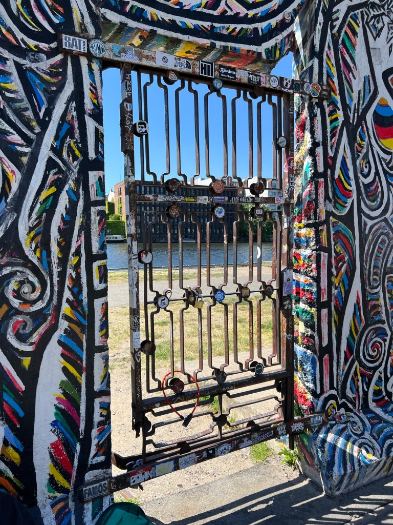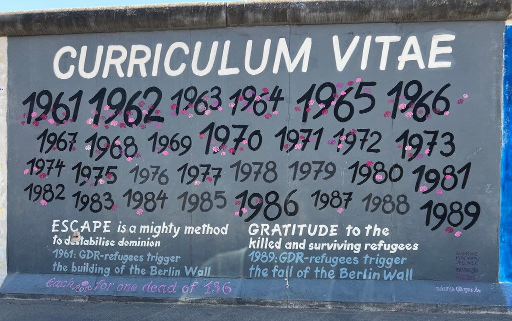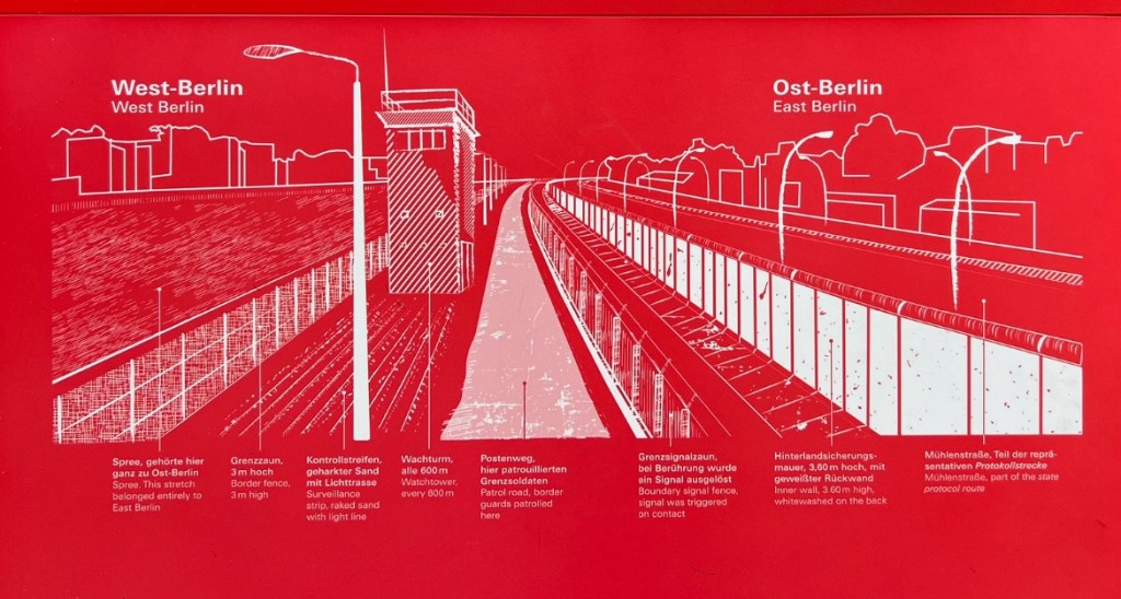 On 13 August 1961 the border here at Muhlenstrasse was built up to block access to West Berlin. But the Wall as it can be seen today was not built until 1977. Behind it was a high security border strip and the Spree, the entire width of which belonged to East Berlin at this point. The wall, the border strip, and the river made escape from the GDR almost impossible. Here the wall looked different than in most of East Berlin. Instead of a simple inner wall, there was the more costly ‘border wall 75’ made of reinforced concrete components which closed off the border strip to West Berlin. It was built here because Muhlenstrasse was part of the protocol route that international guests of the GDR government took from the airport to the city center.