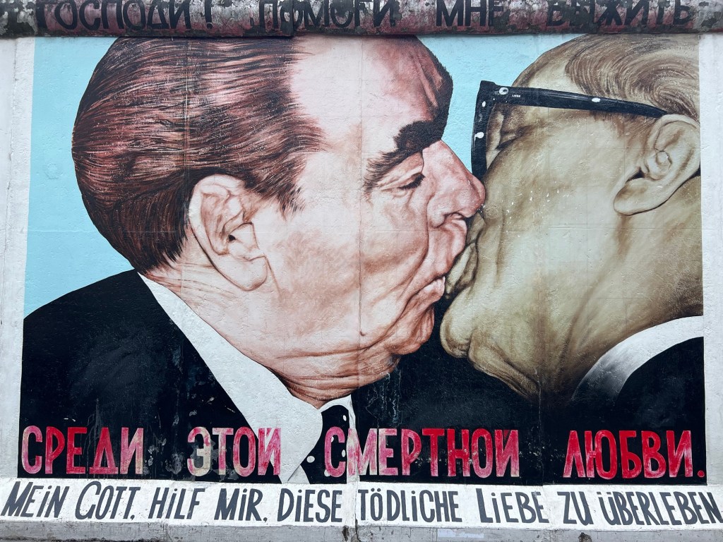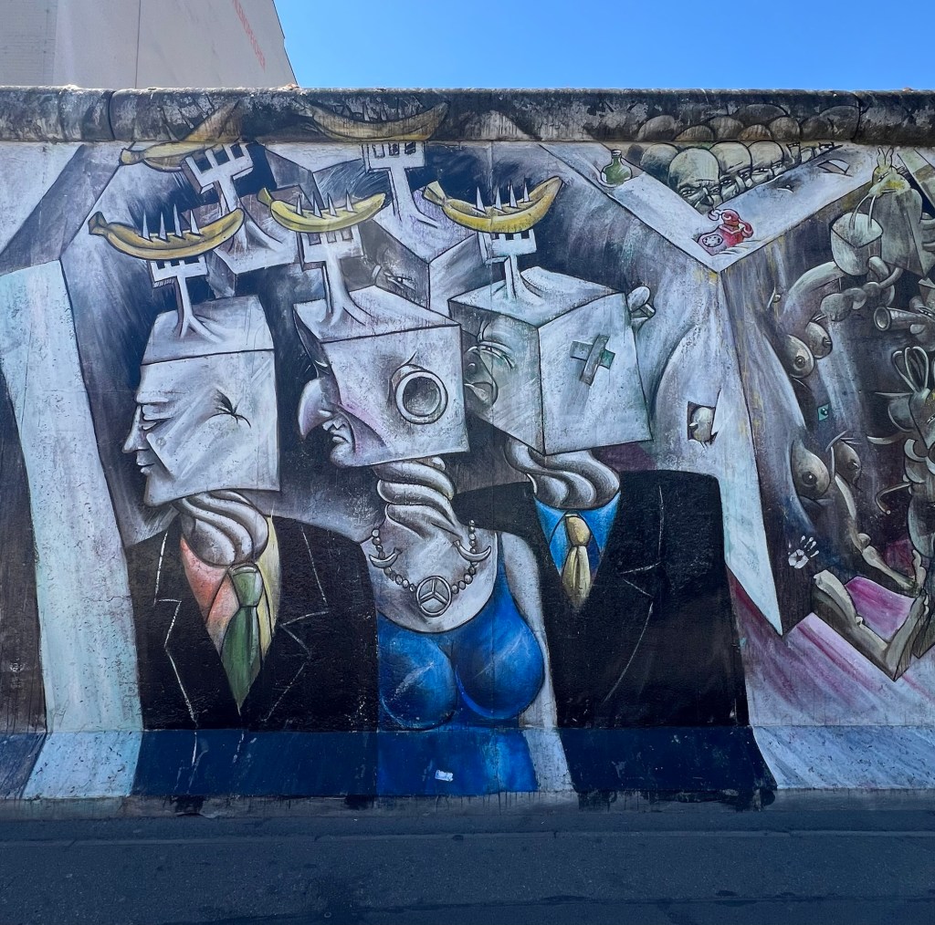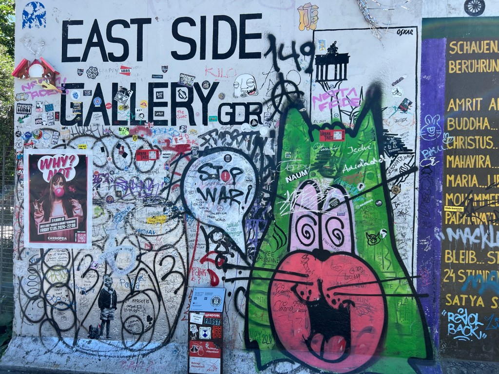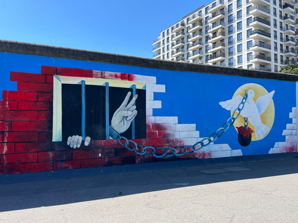 A few weeks after the Wall fell in November 1989 West Berliner David Monty and East Berliner Heike Stephan announced thier idea to turn the Berlin Wall into the longest gallery in the world. The GDR government approved the painting action and assigned them the 1.3 km long wall in Muhlenstrasse. 118 artists from 21 countries responded to the call and the opening of the East Side Gallery was celebrated with a big party on 28 September 1990. With their messages and comments the artists raised a monument to the joy at seeing the Wall come down and the Cold War overcome, yet some critical comments were also made. In the following years the Gallery was restored and changed several times but it still tell of the sense of new beginnings in 1990.