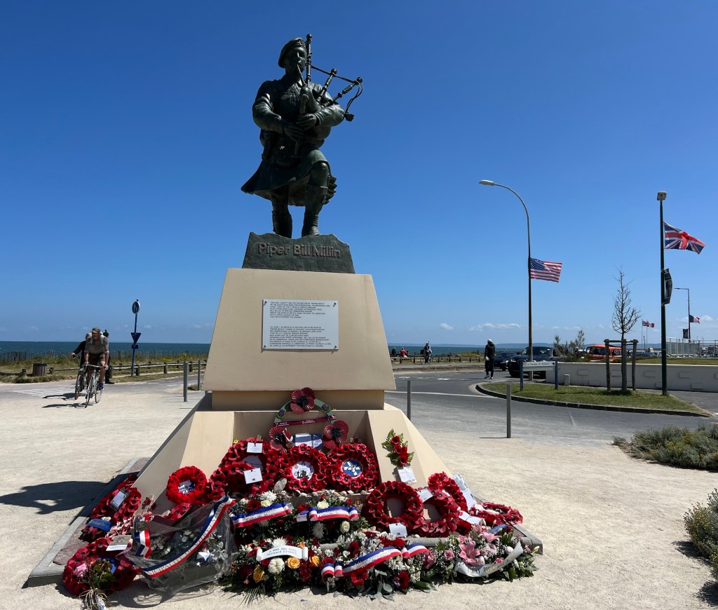On D-Day, on this section of Sword Beach, the Brigadier Lord Lovat, Chief of the 1st Special Service Brigade, ordered his personal piper, Bill Millin, to pipe his commandos ashore. To the sound of Millin’s bagpipes, the commandos later marched across Pegasus Bridge. One D-Day veteran, Tom Duncan, recalled, ‘I shall never forget hearing the skirl of Bill Millin’s pipes. It gave us a great lift and increased our determination’. Millin was ‘just trusting to luck that I did not get hit’ and stated that he later talked to captured German snipers who claimed they did not shoot at him because they thought he had gone mad.