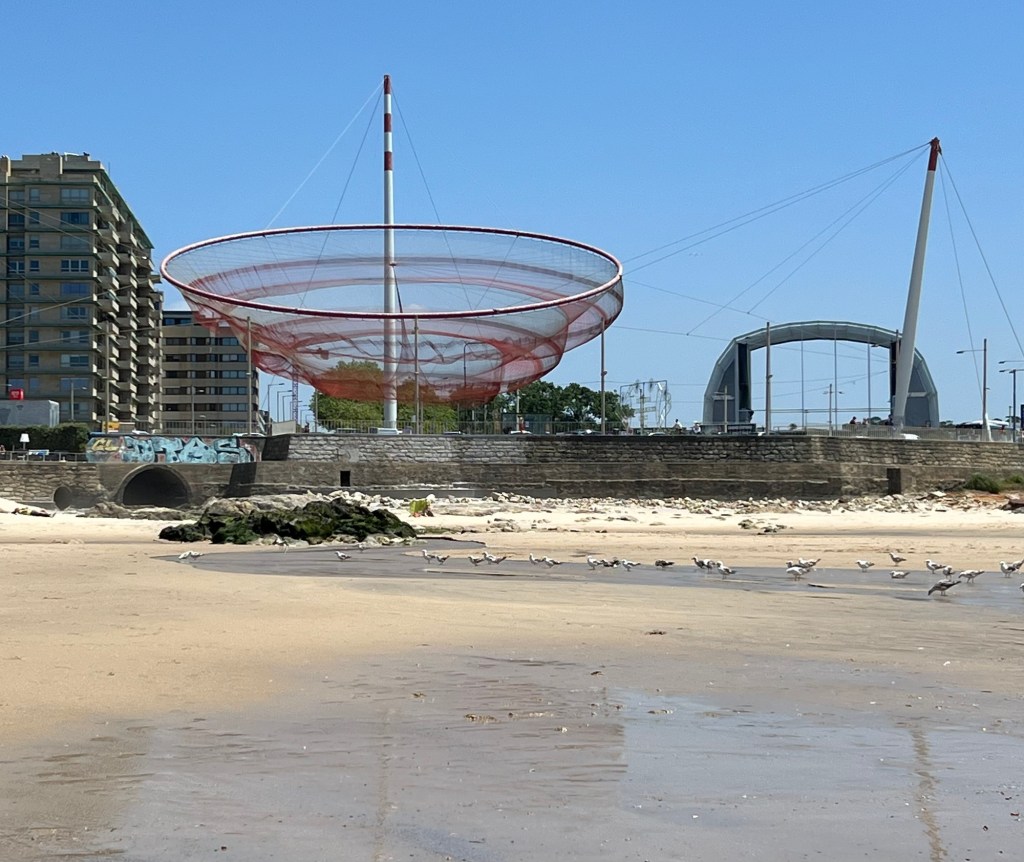 This sculpture was designed and built by an American artist, Janet Echelman, in 2005. Held by three metal posts it consists of a giant net with a diameter of 42 meters and swings in the wind, mimicking the movements of anemones.